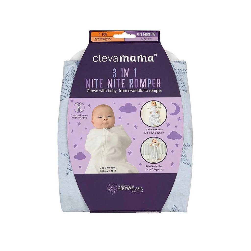 O Saco de dormir Cueiro e Macacão Nite Nite Romper 3 em 1 Azul - Clevamama é ideal para bebês a partir do nascimento até 9 meses. Projetado para oferecer conforto e segurança ao bebê durante o sono, é super macio e confortável e cresce com o bebê durante e após a fase de enrolar.